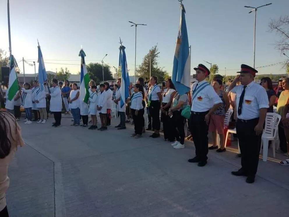 Fue en la Plaza san Martin que se desarrolló el acto por el aniversario Nº 100. Del mismo fueron parte autoridades provinciales, el Intendente Luis Ivancich junto a las autoridades municipales, instituciones locales y regionales, el Intendente de Chichinales, Alberto Pacenti y público en general.