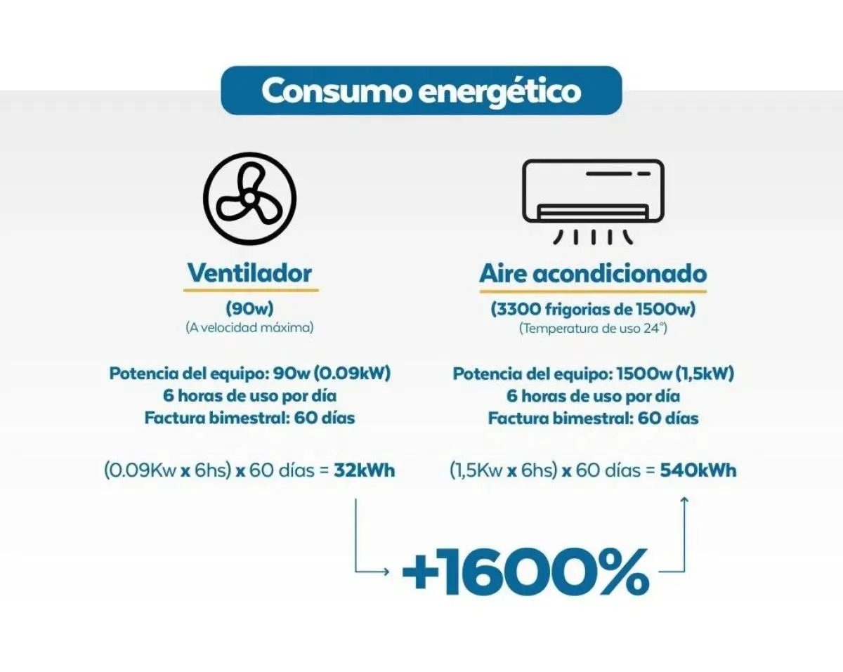 Por otro lado, un aire acondicionado en su temperatura de uso marcada en 24°, conlleva a que la potencia del equipo sea de (3300 frigorías de 1500w), también tomando como promedio 6 horas de uso al día, en una factura bimestral. Esta ecuación queda expresada de la siguiente manera (1,5Kw x 6hs) x 60 días = 540kWh. El resultado final se resume a que si optamos por utilizar esta segunda opción, tendríamos un incremento de +1600%.