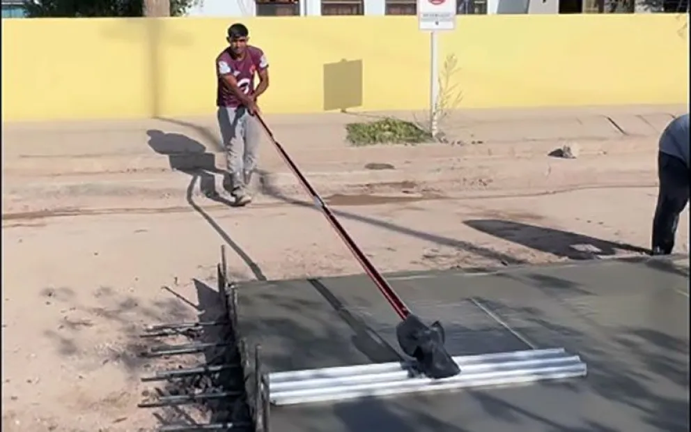 Hoy, finalmente se inicio la construcción del primer tramo del asfalto con paños de hormigón frente a la escuela primaria y el jardín de infantes.