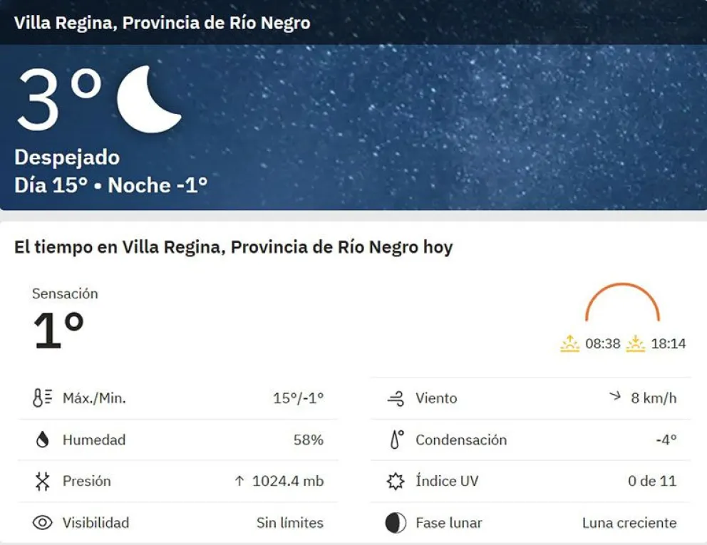 En la zona urbana de Villa Regina la temperatura a primera hora de la mañana marcó los 3 grados, aunque la sensación térmica era de -1 grado; pero en la zona de chacras la mínima llegó en algunos puntos a los -4 grados.