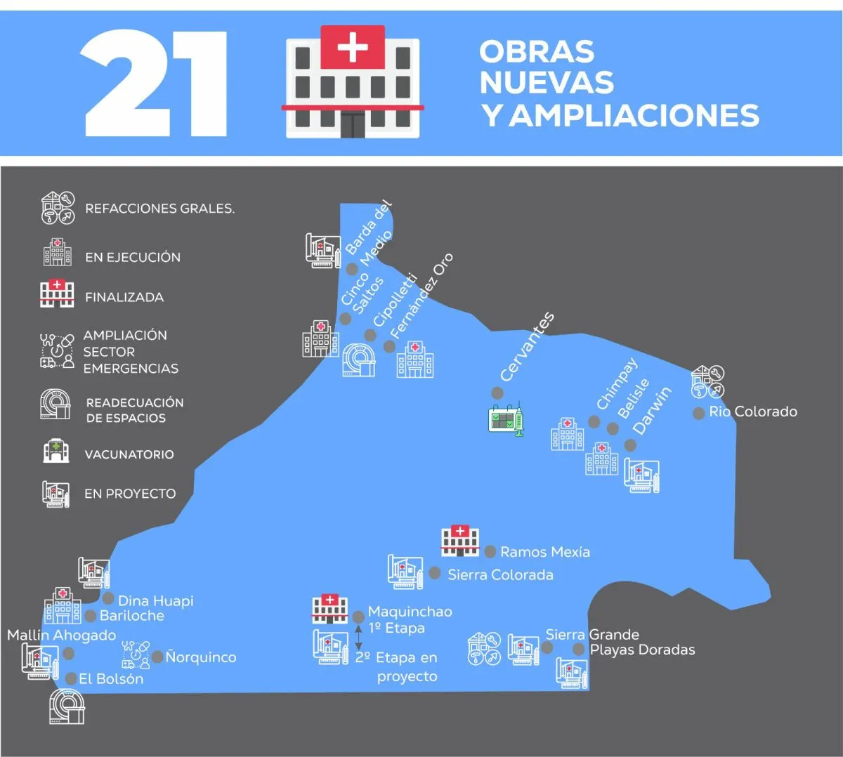En este esquema se construirán nuevos hospitales en Sierra Grande, Sierra Colorada, Barda del Medio, Darwin, Dina Huapi y un nuevo centro de Salud en Mallín Ahogado. Actualmente, estos nosocomios se encuentran en etapa de proyecto, con el objetivo de iniciar en el corto plazo con los procesos licitatorios correspondientes.