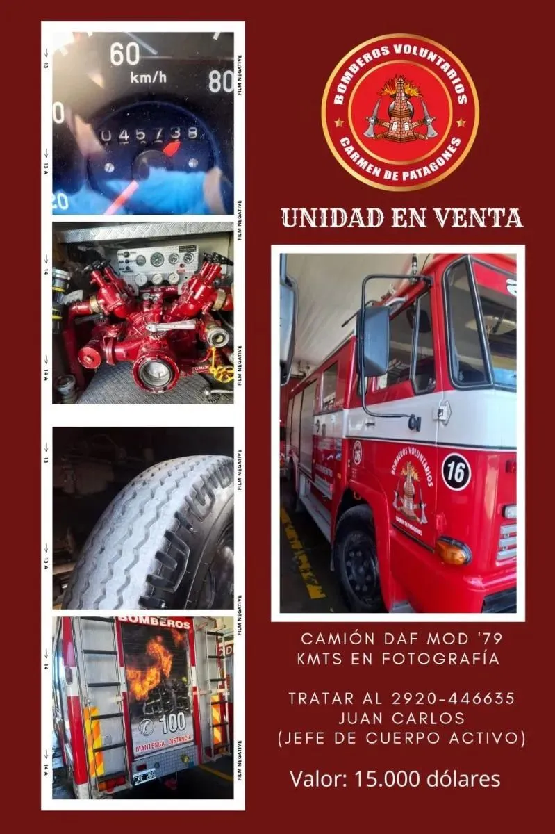 Bomberos Voluntarios de Carmen de Patagones pusieron a la venta una unidad. Se trata de un camión DAF modelo 1979, con más de 45 mil kilómetros recorridos.