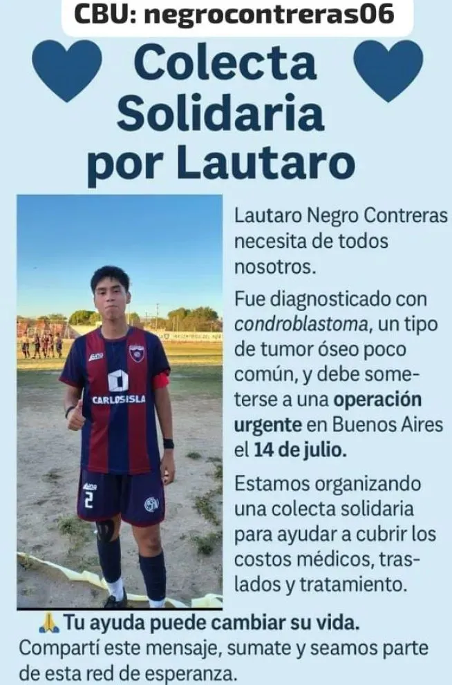 Ante esta situación, familiares, amigos y su club de futbol compartieron una colecta solidaria con el objetivo de colaborar económicamente para cubrir los gastos médicos, el traslado y el tratamiento que Lautaro requiere.