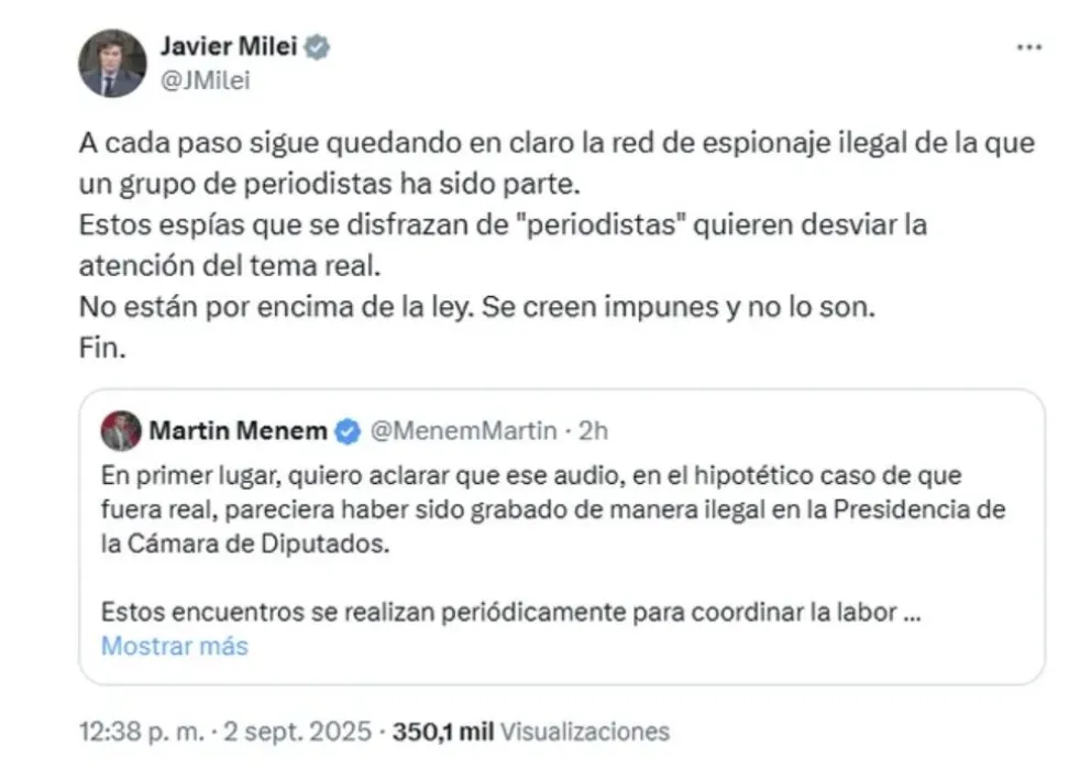 Apenas se conocieron estas grabaciones, Milei levantó la voz para denunciar lo que considera una red de espionaje orquestada por individuos que, según él, operan bajo la fachada de periodistas. “Hay una red de espionaje ilegal de la que un grupo de periodistas ha sido parte”, declaró enfáticamente en su cuenta de la plataforma X, estableciendo una postura rígida ante el trato mediático que ha recibido el caso.