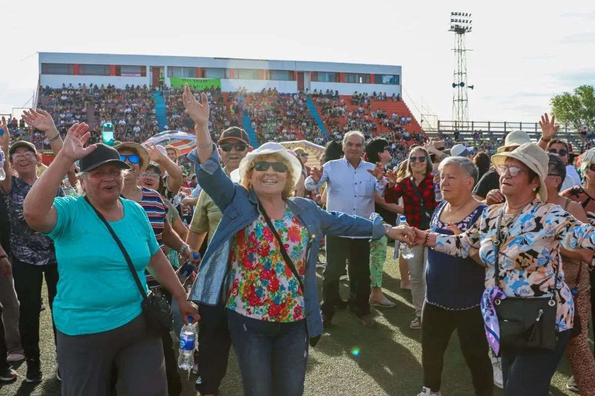El Estadio Luis Maiolino de General Roca está colmado: unas 4.000 personas ya copan las tribunas y el campo de juego en la celebración masiva organizada por el día Internacional de los Adultos Mayores.