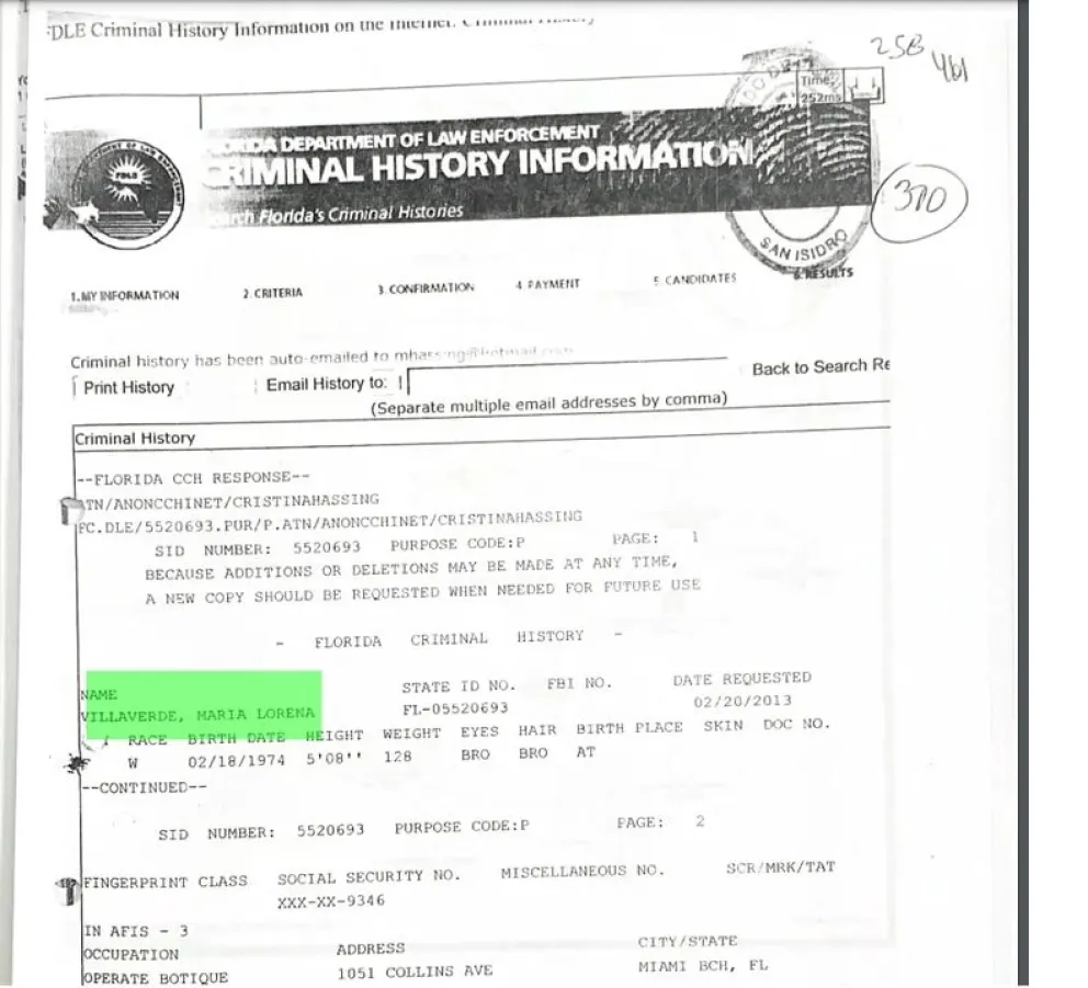 En 2001 ella vivía en Miami, más precisamente sobre la Avenida Collins y decía trabajar como vendedora en una boutique. El 20 de noviembre de 2011 fue su primer arresto por obstrucción de la justicia y fue apresada por el departamento de policía de Miami Beach. La causa tiene el número 0792136.