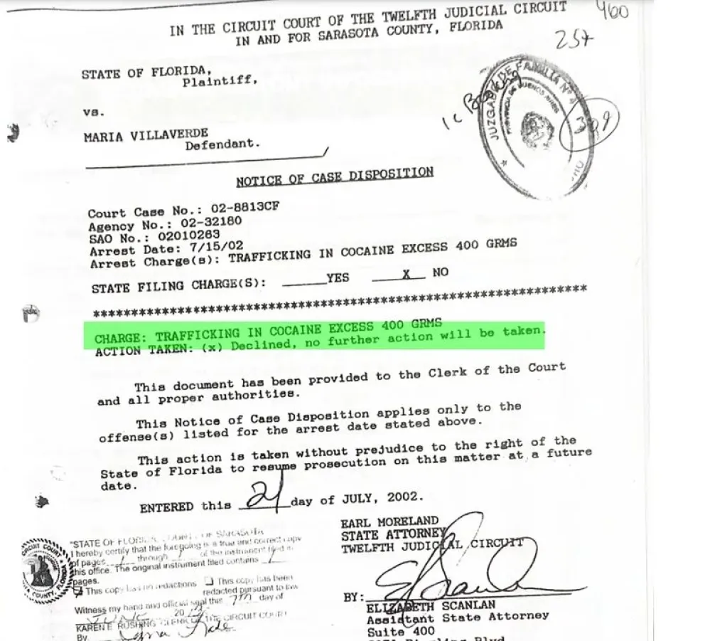 En la causa, hay una categoría de contrabando que lleva una pena de quince años de prisión, que comprende desde 400 gramos a 150 kilos. La instalación de que ella transportaba 400 gramos viene de esta banda de aplicación en la que la mínima es es cantidad de gramos y fue la que se tomó como efectiva en el caso de Lorena Villaverde, pero dos fuentes diversas ligadas a la causa nos confirmaron que en el expediente, al que tuvieron acceso de manera completa, figuran quince kilos de cocaína como los trasportados por la mujer y sus dos cómplices quienes, además, transportaban 50mil dólares que no pudieron justificar. La justicia, además, decomisó 17 mil dólares más en el domicilio de la detenida, tal como da cuenta incluso un medio de Tampa de ese momento.