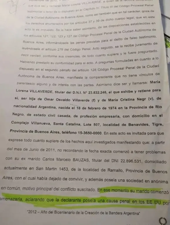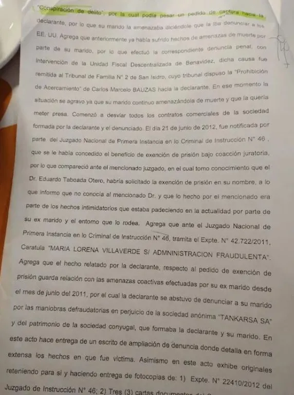 En el expediente de divorcio, se anexó como prueba documental todo el devenir delictivo de María Lorena Villaverde en USA y posteriormente en Argentina. Allí consta que luego del casamiento, y cuando el matrimonio era ya socio en la empresa Taskarsa, en donde la mujer oficiaba de gerente general con absoluto acceso a cuentas -que manejaba casi en exclusividad- los movimientos de dinero empezaron a llamar la atención de Bauzas. Dos años después un email anónimo, proveniente de una cuenta fake y desde una computadora con IP en China, alertaba a Bauzas de que Villaverde no era la persona que él creía y detallaba su paso delictivo por el país del sueño americano.