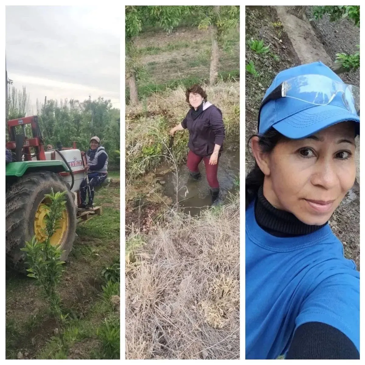 Las imágenes de Patricia, María Ángela y Susana resumen lo que ocurre cada amanecer en las chacras del Alto Valle. Mientras el agua corre por las acequias, ellas limpian, podan y preparan la tierra. Una de ellas se mete hasta las rodillas en el agua para destrabar el cauce y que el riego avance; otra arranca malezas para que la planta respire.