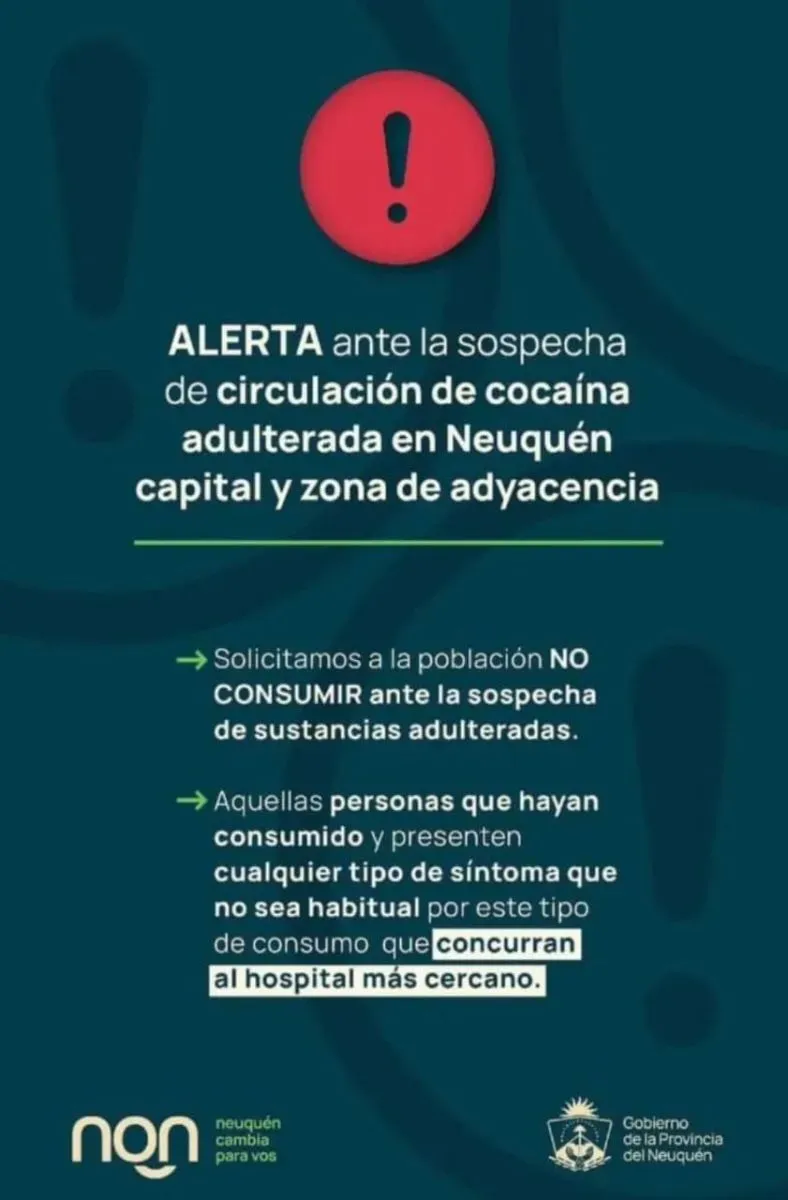 Las autoridades sanitarias emitieron una alerta ante la sospecha de circulación de cocaína adulterada en Neuquén capital y zona de adyacencia. Informaron que, además, un tercer paciente se encuentra en terapia intensiva con el mismo antecedente de consumo de cocaína. Desde el Sistema Público de Salud hicieron un pedido de precaución a la población y evitar el consumo (especialmente ante la sospecha de sustancias posiblemente adulteradas).