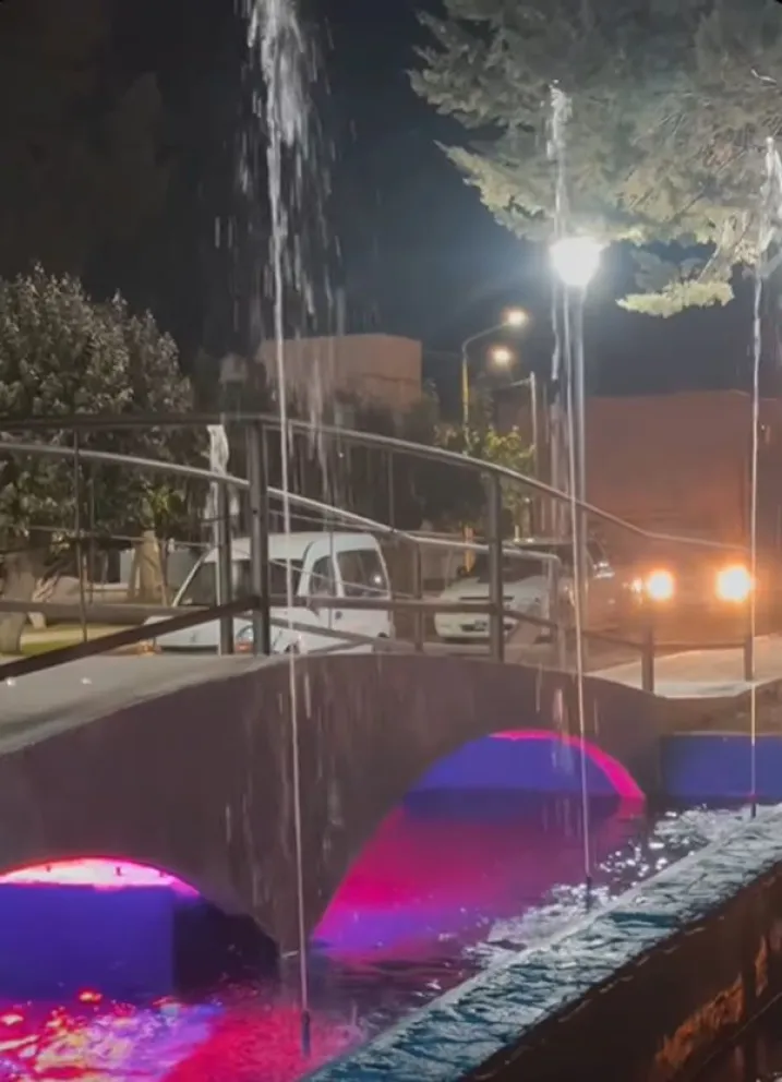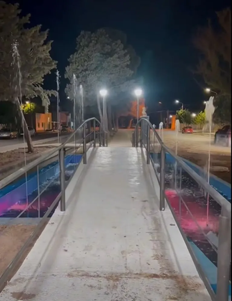 En la fuente de agua, se colocó “un sistema de movimientos ascendentes, con cañerías, boquillas y conexiones adecuadas, logrando un efecto visual acorde al diseño previsto”, a lo que se sumó la construcción de un “cordón cuneta para ordenar los escurrimientos pluviales, delimitar áreas y mejorar la integración de la pasarela y la fuente con el entorno urbano inmediato”.