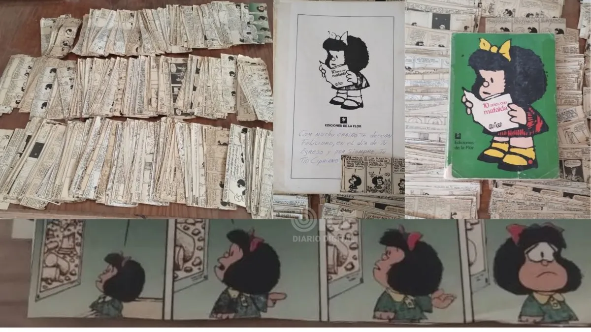 Sonia colecciona tiras originales de Mafalda: tiene más de 500 y ninguna repetida. Empezó a los 12 años recortando diarios en Choele Choel, conoció a Quino en 1994 en Neuquén y aún conserva cada tira con cuidado.