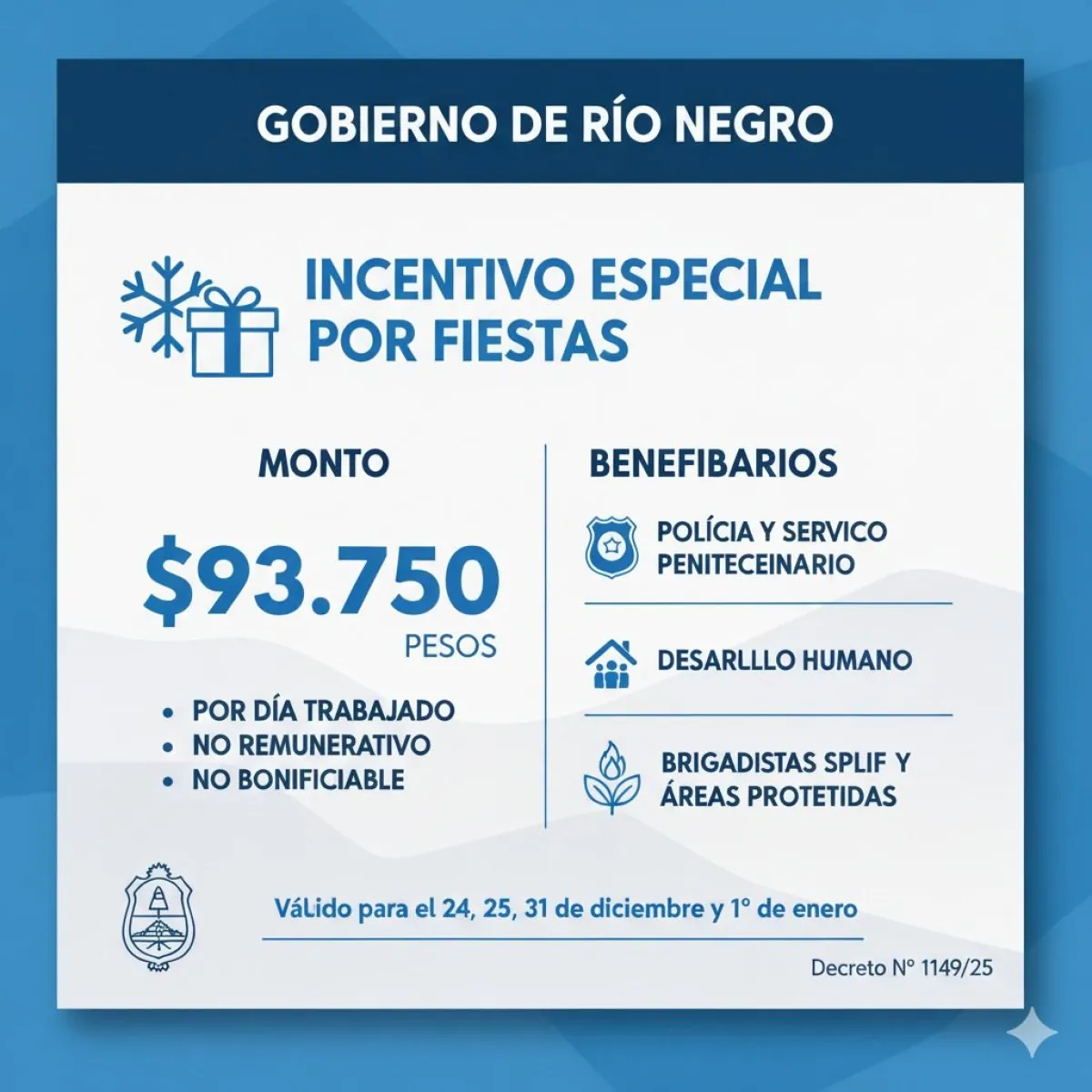 A través del Decreto N° 1149/25, el Gobernador de Río Negro Alberto Weretilneck formalizó la creación de un incentivo especial y funcional destinado a los agentes que prestaron servicios efectivos durante los días 24, 25, 31 de diciembre de 2025 y 1º de enero de 2026.