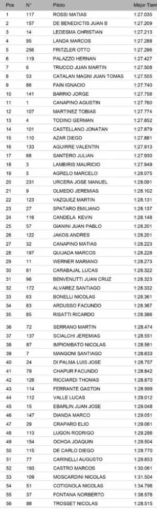 El dominio del Pradecon Racing fue uno de los grandes datos del sábado: cinco de sus seis autos se metieron entre los diez mejores. Además de Rossi y Ledesma, también se destacaron Marcos Landa (4º), Hernán Palazzo (6º) y Jorge Barrio (10º), mientras que Valentín Aguirre completó el grupo en el 16º puesto.